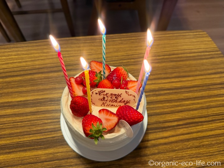 先週はすき焼きをごちそうになりましたが、昨日は誕生日ケーキをいただきました。ろうそくの本数は適当です。cofect concept(コンフェクトコンセプト)で先週予約していました。彼が昨日帰宅する前に車でお店に寄って受け取ってくれました。